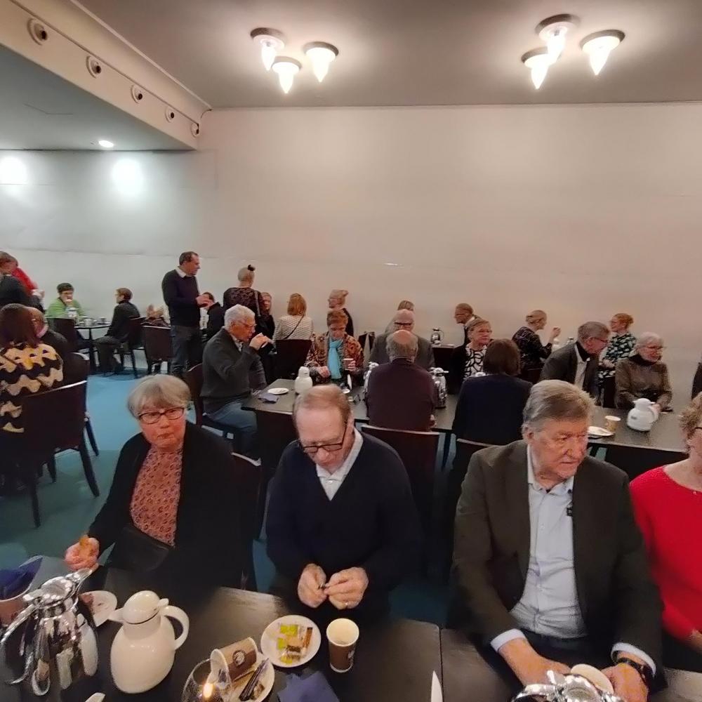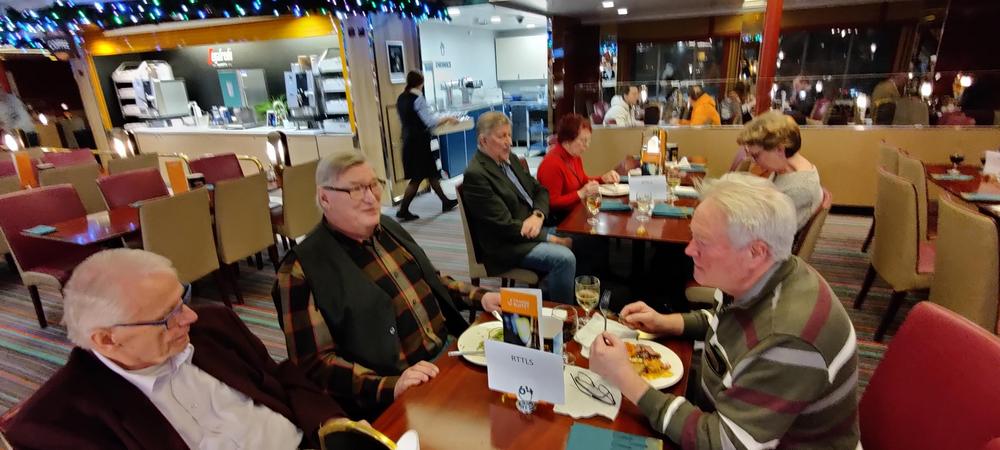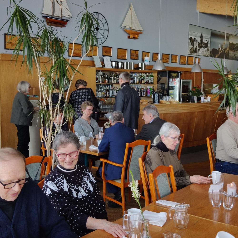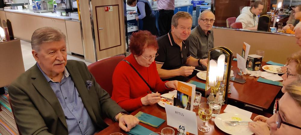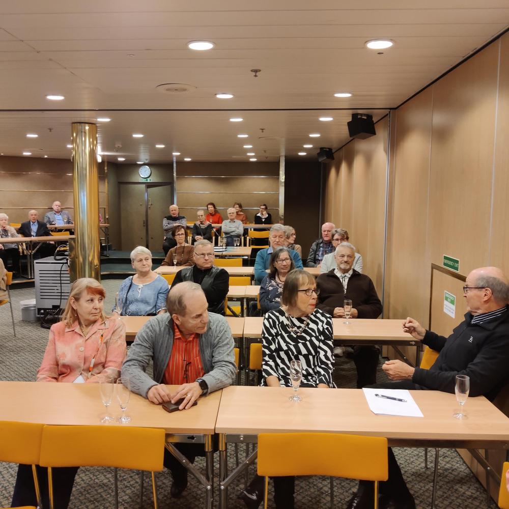 Senioreiden yhteistilaisuus oli laivan kokoustiloissa heti kotimatkan alkajaisiksi.
